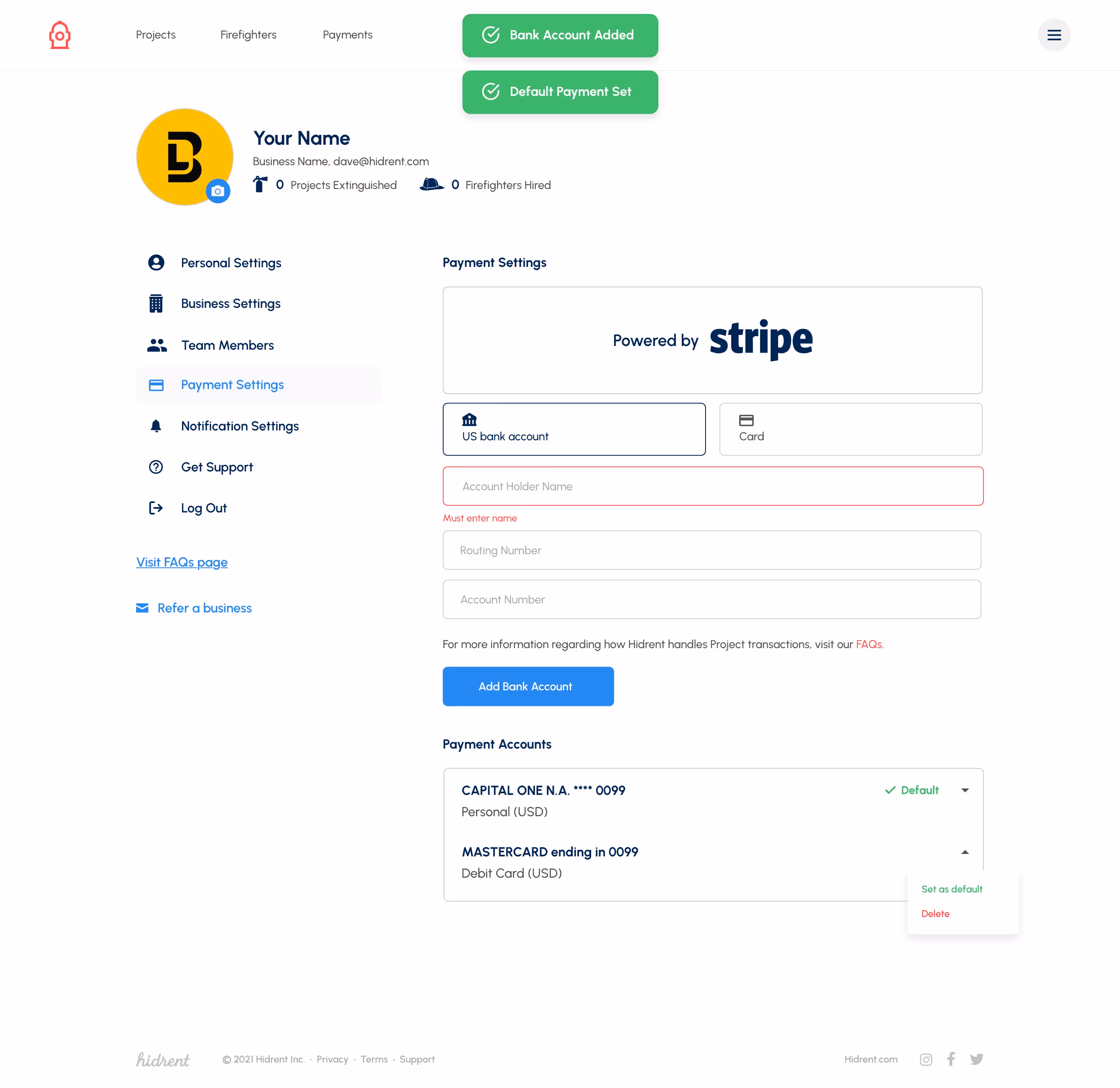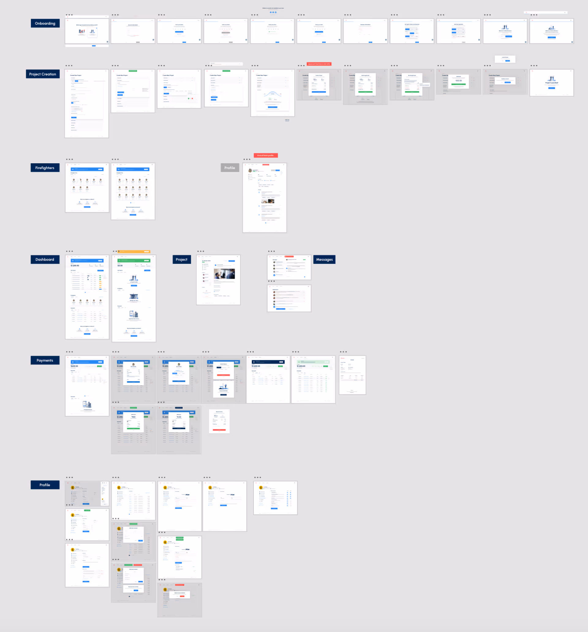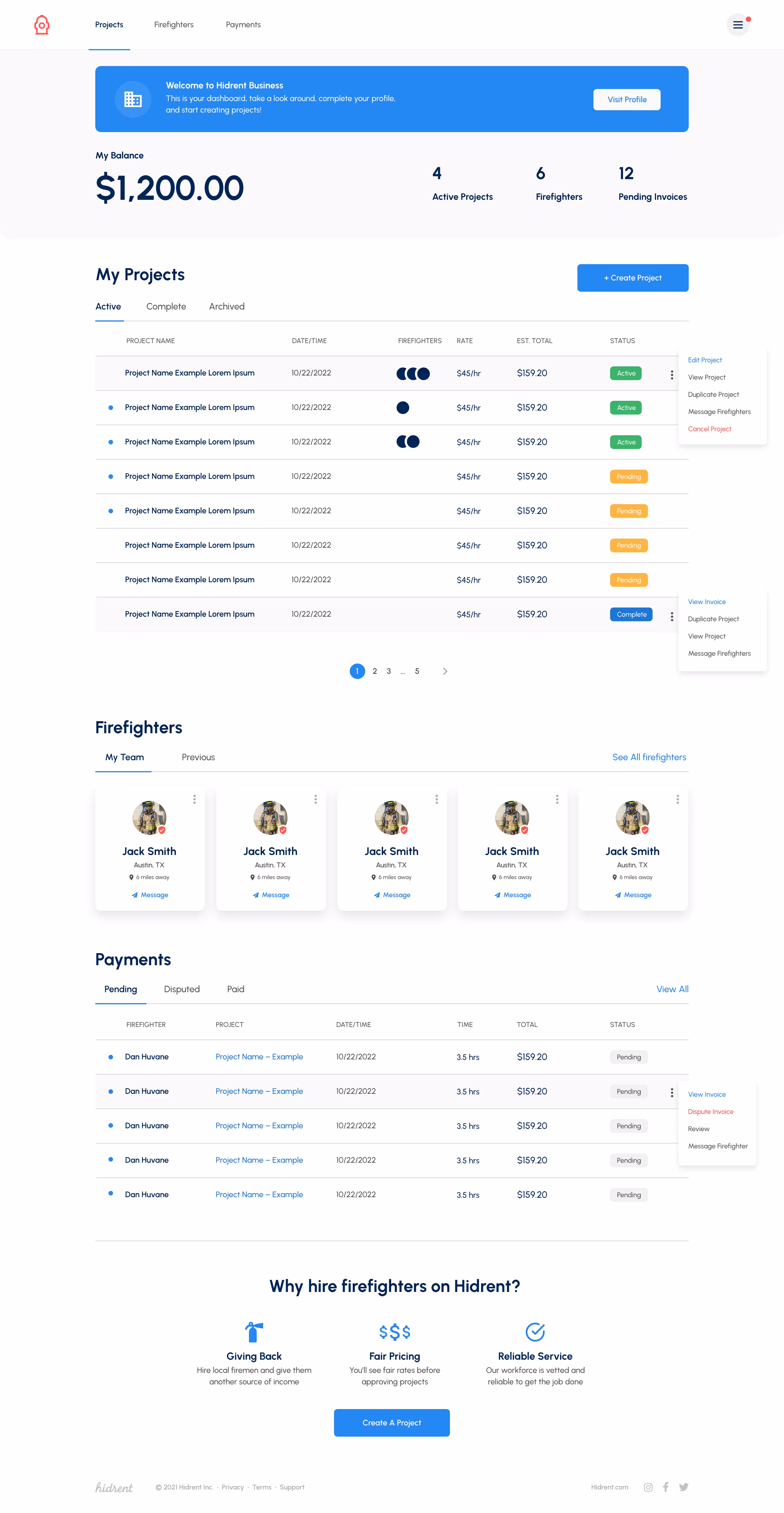 Working closely with stakeholders, I designed a comprehensive dashboard system that streamlines project creation, firefighter selection, and payment processing. The new interface allows businesses to track active projects, manage team permissions, and maintain ongoing relationships with trusted firefighters in their area.